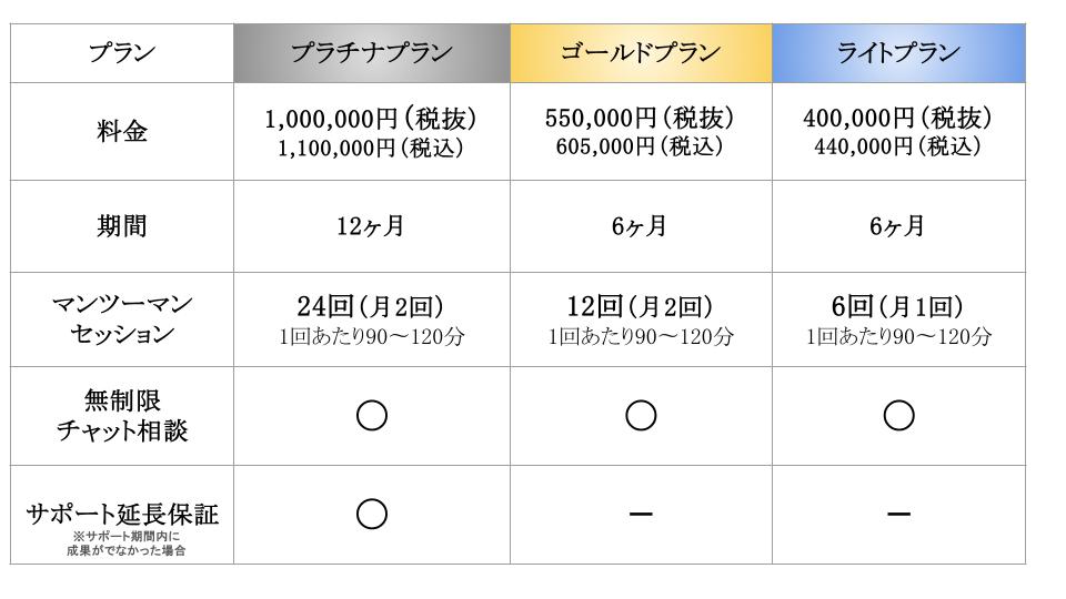 そこから再びゴールドコースをご契約いただくこともありますが、成果が出るまでしっかりやる覚悟がある方は料金や保証含めて最初からプラチナコースの方がおすすめです。