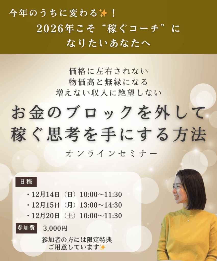 こういったお金のブロックを外し、稼ぐ思考を手にして豊かな自分に変えていくための機会を今月だけ、限定でご案内しています。